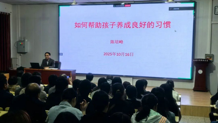 10月16日晚,我校初中部西區(qū)2025級家長學(xué)校第二期專題講座順利開設(shè)。500余名家長通過現(xiàn)場參與及微信直播的方式,共同聆聽校長助理陳培峰《如何幫助孩子養(yǎng)成良好的習(xí)慣》主題講座,講座聚焦新生初中適應(yīng)關(guān)鍵期難題,系統(tǒng)指導(dǎo)習(xí)慣培養(yǎng)策略。