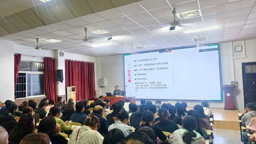 講座伊始,陳校助結(jié)合七年級學(xué)生實際表現(xiàn),直指新生適應(yīng)痛點:初中階段學(xué)習(xí)科目增多、難度提升,部分學(xué)生出現(xiàn)作息無序、學(xué)習(xí)浮躁、成績波動等問題,核心在于習(xí)慣銜接不足。他強調(diào):“初中是習(xí)慣養(yǎng)成的黃金期,好習(xí)慣是自主學(xué)習(xí)的基石,更是未來發(fā)展的底層能力。”這一深刻洞察為講座奠定了“以習(xí)慣為基”的核心基調(diào),引發(fā)家長深思。