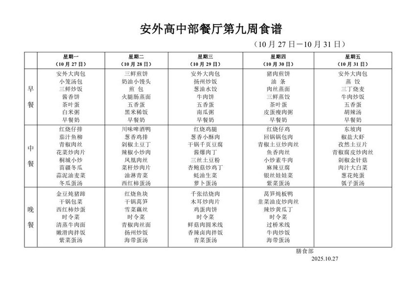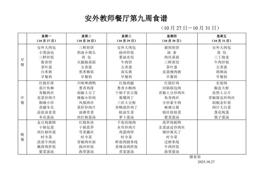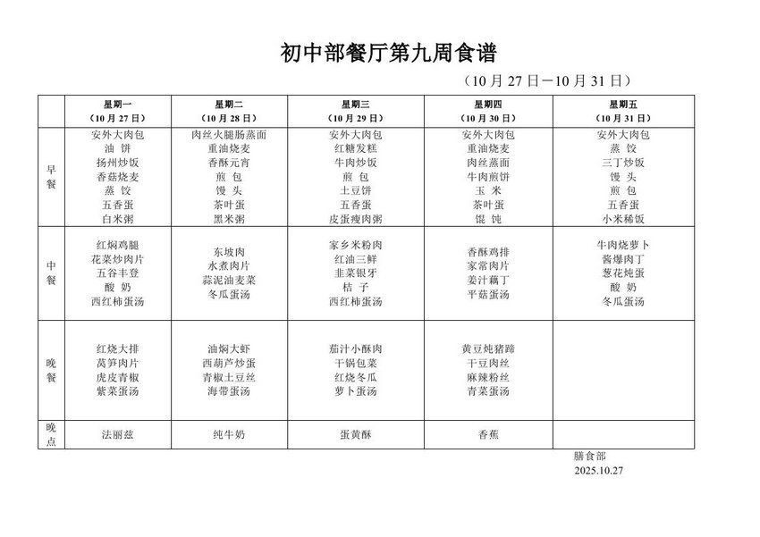 2025-2026學(xué)年度第一學(xué)期第九周食譜